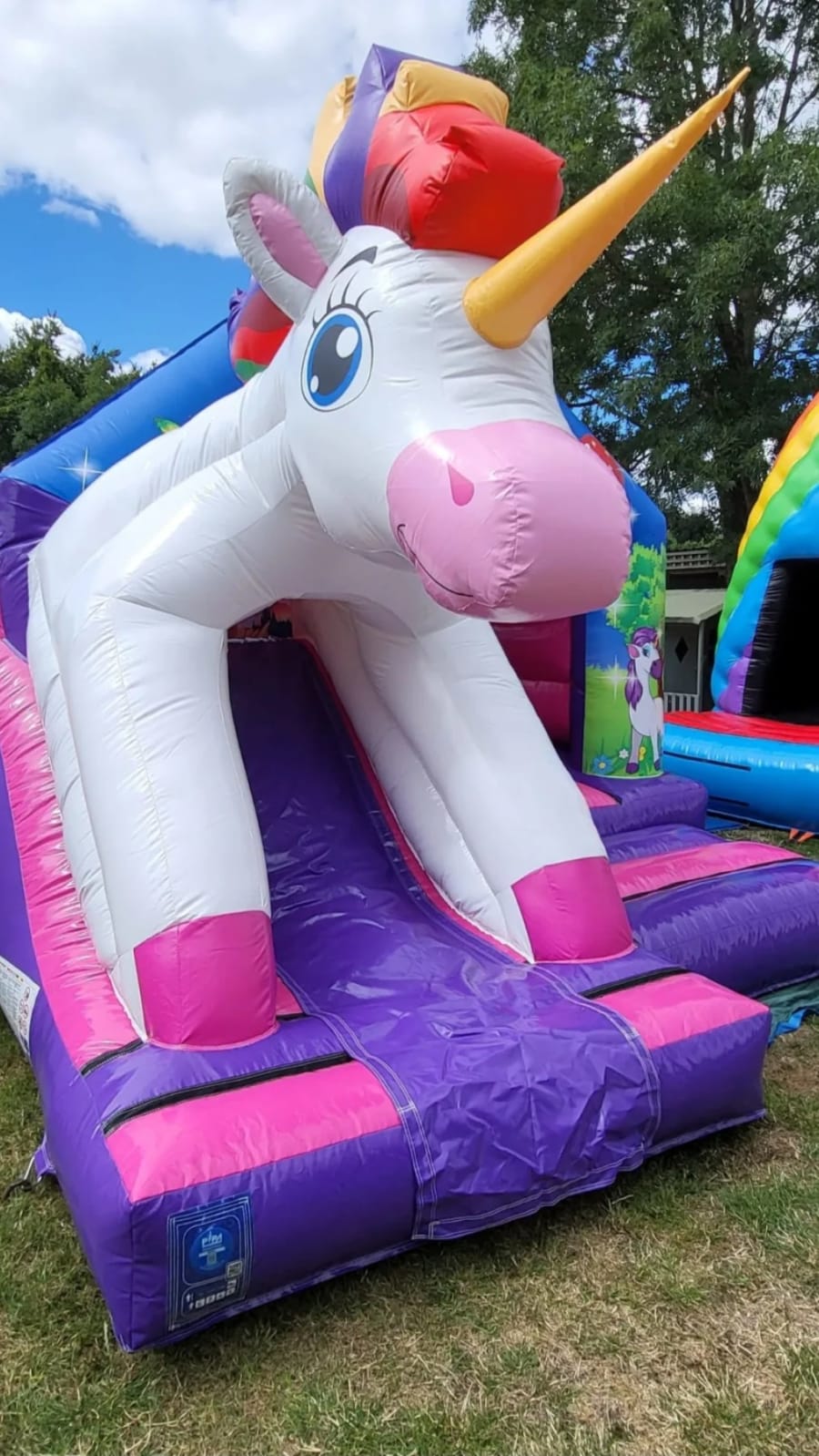 Bouncy castle with a front facing Slide and an amazing 3D Unicorn head. Perfect for a little girls' birthday party.