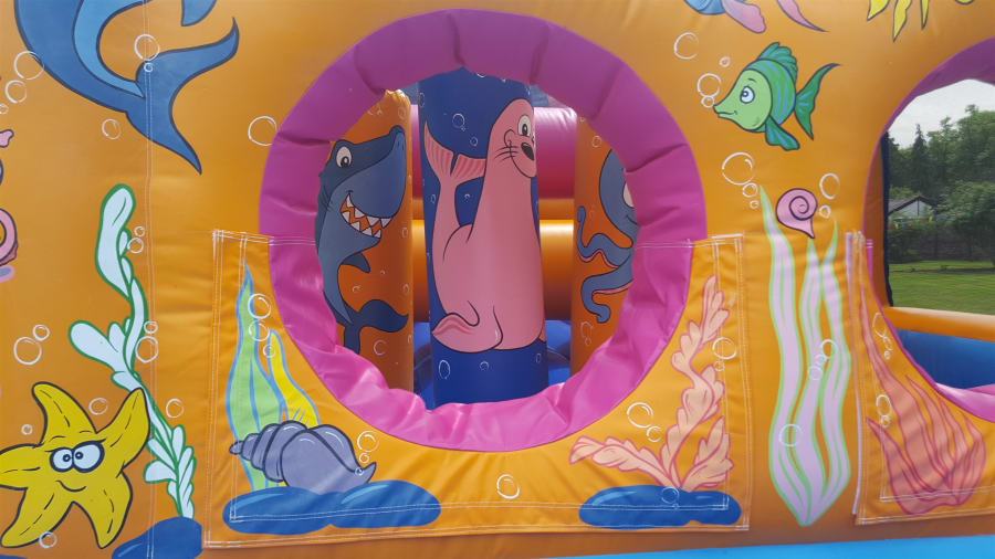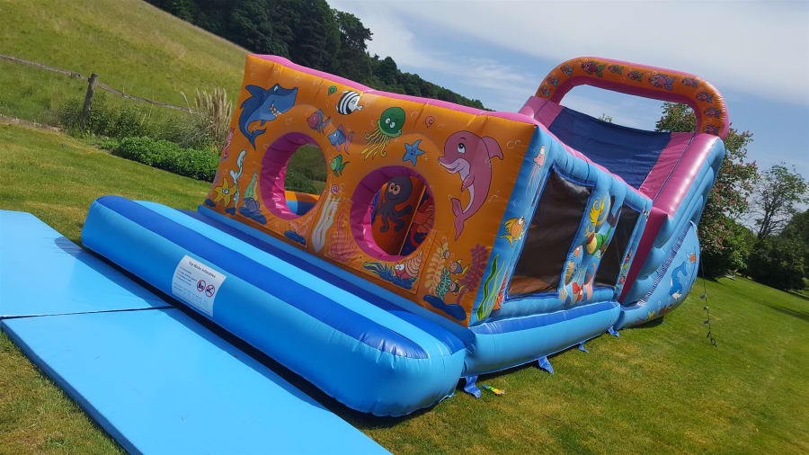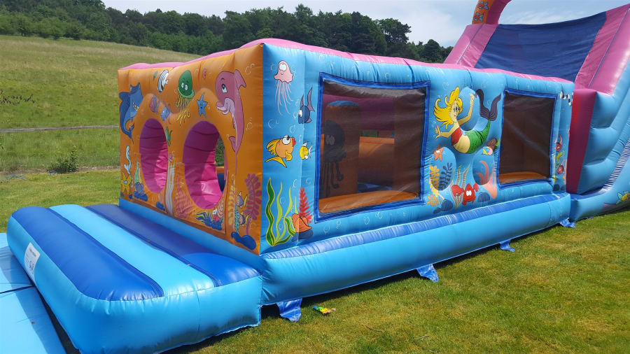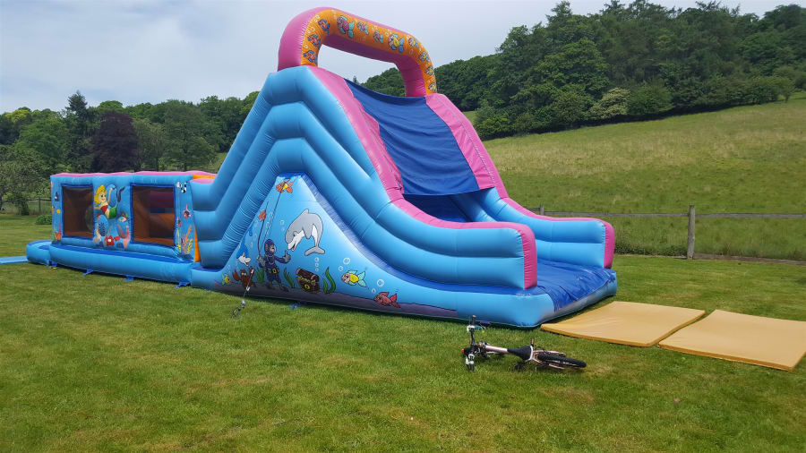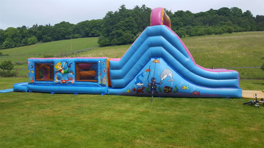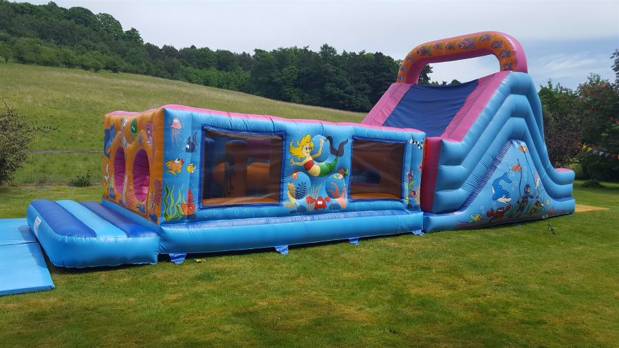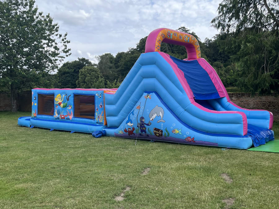 This is great fun, designed for up to 14 year olds they have to Jump through the wall to bash there way past the bashers, negotiate the squeeze tubes and on to the ladder climb to get to the top of the slide ready to start again, Excellent for girls and boys birthday parties, school fetes, corporate fun days and football tournaments